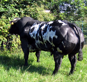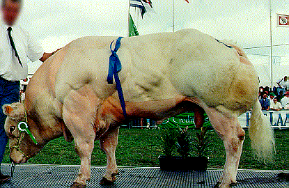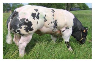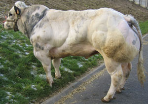 Из самого названия породы, уже ясно от куда она, и какого цвета. Цвет конечно, не совсем голубой, это бывают пятна на шерсти данного цвета. Сами же коровки могут иметь тона, как от постельного белого, так и до чёрного. Так же имеются и другие названия этой породы: Race de la Moyenne и Haute Belgique. История начинается в 19 веке, в центральной Бельгии. Молочной породе Shorthorn, из Англии, решили нарастить мяса и начали скрещивать с бельгийскими Charolais, путём искусственного оплодотворения. В ходе данных опытов, получили коров и быков, с мутацией белка миостатина. Что бы закрепить эффект, селекционеры применили Инбридинг -  это скрещивание близкородственных форм в пределах одной популяции организмов. И только в 50 годах прошлого столетия породу довёл до совершенства профессор Hanset. Но вот мясо получилось очень постное, с малым содержанием жира и очень нежное, за что и полюбилось многим. Представители данной породы, могут набирать вес более 1 тонны. Но вот с родами бывают проблемы, из-за размеров плода, зачастую приходится делать Кесарево сечение. В некоторых странах, данная порода запрещена к выведению. Лично я поражён, этими коровками и быками. Такое ощущение, что они не на лугу пасутся весь день, а потеют в тренажёрке, по особой программе, наращивания мышц.