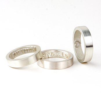 Южнокорейский дизайнер Jungyun Yoon, начала заниматься выпуском интересных колец Inner Message Ring. Ювелирные изделия из серебра и золота, несут особый смысл. Мы привыкли видеть вырезанные в металле надписи. Кольца из серии Inner Message Ring, наоборот имеют выпуклые буквы и сердечки, на внутренней стороне. По идее они задумываются как обручальные. Их можно купить на официальном сайте дизайнера, по цене от $120 до $780. Я думаю, вы понимаете, что цена варьируется, от выбранного метала, его веса и выполненной работы. К сожалению, ни где не нашел точной информации о том, что кольца делаются только с определёнными надписями или можно заказать свои. Приятный момент этих колец, на пальце остаётся отпечаток слов или символов, написанных внутри. Очень романтичный подарок, особенно когда предлагаешь руку и сердце или просто хочешь подарить радость своему любимому человеку.