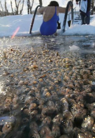 Зима в этом году выдалась суровой, почти для всех обитателей нашей планеты. На фотографиях рыбка из прудов Санкт Петербурга. Толстый лёд совсем не пропускает кислород к водной массе. Солнечный свет так же не попадает под лёд, а из-за этого флора водоёмов не может произвести фотосинтез, в результате которого и получается кислород. Мелкие рыбки сейчас как в концлагере, ищут любые дырки во льду, лижбы немного дыхнуть. У них сейчас самое что ненаесть, кислородное голодание. Посмотрите, сколько рыбы в прорубе для купания "моржей". Жалко рыбку, и ни кто ее, наверное, не поможет.