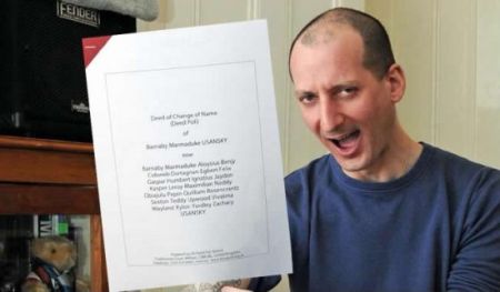 Ему сейчас 36 годиков, и раньше у него было вполне обычное имя Barnaby Usansky. Сейчас же, простого английского безработного зовут Barnaby Marmaduke (прикольно, так как есть такой киноперсонаж, собака) Aloysius Benjy Cobweb Dartagnan Egbert Felix Gaspar Humbert Ignatius Jayden Kasper Leroy Maximilian Neddy Obiajulu Pepin Quilliam Rosencrantz Sexton Teddy Upwood Vivatma Wayland Xylon Yardley Zachary Usansky. Друзья этого чудака в шоке. Они хотят его называть по прежнему, но он на это обижается. Как утверждает бывший Barnaby Usansky, ему давно хотелось сменить имя, просто он очень сентиментален, и к каждому слову из нового имени он относится с особым трепетом. Кстати, в Британии это не первый случай с изменением имени. Вот в 2008 году, подросток, которому тогда было 19 лет, взял имя Captain Fantastic Faster Than Superman Spiderman Batman Wolverine The Hulk And The Flash Combined. Законы Англии не запрещают таких смен имён, вот только будет несколько затруднительно заполнять разные бумаги и писать своё имя.
