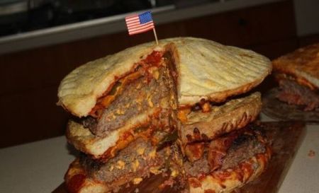 Этот материал специально для обжорок, любителей, не здоровой и не очень полезной пищи. Худенькая блондинка, похожая на Джулию Робертс, показывает своё фирменное блюдо. Ни чего сложного, бёрётся 3 пиццы, и делаются 2 большие котлеты, ещё по вкусу бекон, огурчики и сыр. Я когда это увидел сегодня, а было это ранним утром, меня чуть не стошнило. Такой сплошной кусок холестерина и жира. Конечно же, ФУ, но может, кому то понравится. Ох уж эти тупые америкосы.