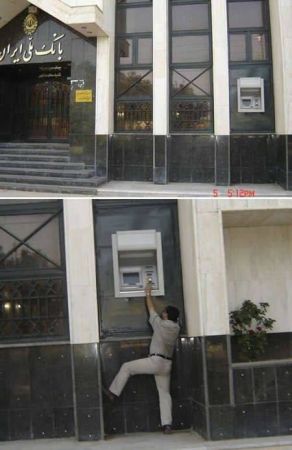 В провинциальных городках, можно до сих пор увидеть в некоторые дни, очереди у банкоматов. То ли менталитет, то ли не развитая инфраструктура, заставляет людей снимать почти все деньги с карточек. Ну а "свято место пусто не бываете", и здесь всегда можно увидеть не совсем обычных людей. А вот и банкомат, который почти на втором этаже встроен в стенку, ну уж совсем удивил.