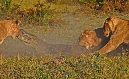 Несколько фотографий, наглядно показывают, как действует прайд. По версии источника, всё началось, с нападения зелёного хищника, на маленького львёнка. Три львицы, увидев это, решили его наказать. Наказали так, что просто разорвали крокодила!
