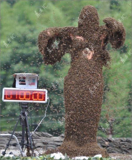 В голову сразу забралось: «Вот оно, утро китайского пчеловода». 17 июля 2011 года в китайском городе Шаоян, прошли интересные соревнования пчеловодов. Правила просты, нужно как можно больше собрать, на своём, почти обнажённом теле, пчёл, стоя на весах. Время соревнования, 60 минут. Из одежды только: шорты, очки для плавания, затычки для ушей и глаз. Для привлечения пчёл, к телу участников прикрепляются «королевы». В этом году соревновались двое мужчин, 42 летний Wang Dalin и 20 летний Lc Kongjiang. После часового сбора, победил тот, кто собрал 26 килограмм пчёл на своём теле. Возможно из-за опыта, а может быть он больше нравился пчёлам, победил Ванг Далин. Его молодой соперник, отстал совсем на чуть чуть, и набрал 22,9 килограммов, живого веса на своём теле. Поражаюсь я этим мужчинам, целый час стоять и чувствовать, как на тебя садятся тысячи пчёл и делают непонятные вещи. Мне кажется, российские пчеловоды так же могли, принять участие в данном соревновании. А в лучшем случае устроить на родине, аналогичное шоу. И оно пользовалось успехом без сомнения, посмотрите на фотографии, сколько в Китае собралось людей. Кстати, мировой рекорд, по сбору пчёл на теле принадлежит американцу Mark Biancaniello, собравшем на своём теле 39,5 килограмм или 350000 тысяч насекомых.