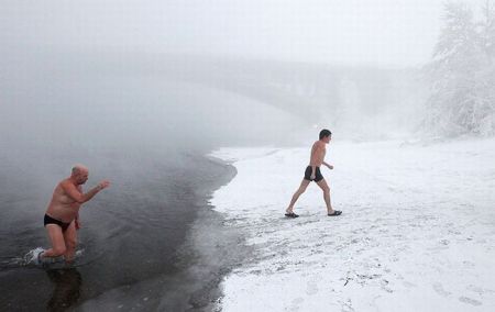 Эти фотографии были сделаны 12 декабря, когда температура воздуха в красноярском регионе, составляла -12С. Люди на фотографиях, это члены местного клуба моржей. Судя по лицам, им очень нравится купаться в Енисеи, в такую погоду. Но мне стало самому зябко, когда увидел всё это сидя в теплой квартирке.