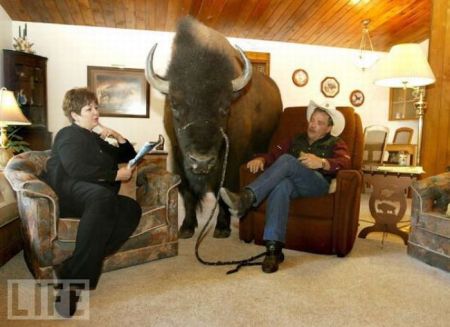 У Джима это уже второй домашний буйвол. Первый по имени Бейли дорос до восьми лет, и его сбила машина. Но Джим похоже большой любитель буйволов, и он приютил еще одного у себя дома. Судя по всему у хозяина данного, экзотического животного, напрочь отсутствует фантазия, и он второго питомца назвал Бейли Младший. Судя по фотографиям, эта парочка вместе занимается многими делами, ну пивко наверно тоже потягивают вместе.