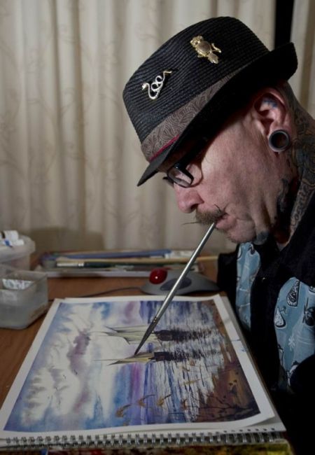 А можно нарисовать красивую картину без рук? Можно если человек трудолюбив и просто любит рисовать. Steve Chambers, художник из Англии, именно такой мужчина. Ему 50 лет и с самого рождения он болен редким заболеванием артрогрипозом. При этом недуге деформируются конечности, и недостаточно развиваются мышцы и суставы. Но это не мешает Стиву, рисовать интересные пейзажи. Как он сам говорит: "Для меня, кисть во рту как для вас ложка в руке". С самого детства, держа карандаш во рту, он начал рисовать. Большая семья, его всегда поддерживала. Он даже учился в художественной школе в 18 летнем возрасте. Болезнь не помешала создать свою семью 22 года назад и иметь 4 детей. Как вы уже поняли, рисует он ртом, при помощи цветных карандашей и кисти. Пейзажи Steve Chambers, наполнены красками и яркими цветами. Наверное, поэтому они красивы и вызывают интерес. Стив является членом ассоциации «Mouth and Foot Painting Artists» (художники рисующие ртом и ногами), в которой на данный момент более 800 членов.