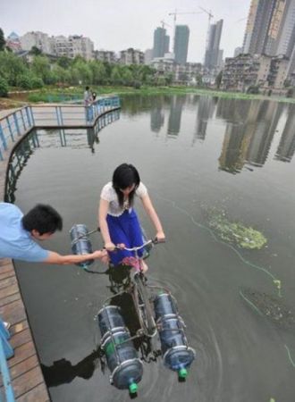 В принципе, с прямыми руками и небольшим желанием можно сделать данное средство передвижения и самому в мастерской или даже в гараже. Принцип работы очень прост. На обычный велосипед, цепляются четыре буйка, а на заднее колесо вешается специальное оперение.