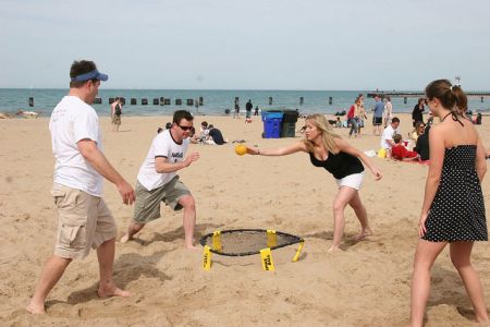 Spikeball - интересная игра с мячом. Для игры потребуется: мячик чуть больше теннисного (похожий на волейбольный), специальный батут небольшого размера. В игре, две команды по 2 человека в каждой, каждый стоит перед соперником. Правила не замысловаты, для начала нужно ввести мяч в игру ударом в батут, игроком одной из команды, я так понимаю что после жеребьевки. Когда мяч подлетел, можно сделать до 3 распасовок внутри команды и обратно отправить в отпружинивающий центр. Отлетев, ход переходит противнику. Игра идёт до 21 очка, кто первый набрал тот и победил. Баллы получают игроки, если: соперник не смог отразить мяч, отскочивший от батута; соперник отбил мяч в землю; соперник сделал более 3 пасов; мяч отбит в землю от противника. В принципе игра молодая и некоторые придумывают правила сами. В Spikeball можно играть в любом месте, на пляже, на газоне, в зале, везде, где будет не больно падать. Инвентарь небольшой, и на официальном сайте игры, стоит всего 50 долларов. Так что дерзайте, спорт молодой, но интересный и достойный внимания. Вот только, я не совсем понял какова его история.