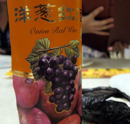 В пекинских супермаркетах, появился интересный напиток, красное вино со вкусом красного лука. Немного поискав, данное сочетание слов в интернете, пришёл к выводу. Два продукта, встречаются и смешиваются, для приготовления маринада к шашлыку и реже как рецепт народной медицины. Бутылочку красного, лукового можно купить за 5 баксов. Может это сделано что бы, просто не закусывать?