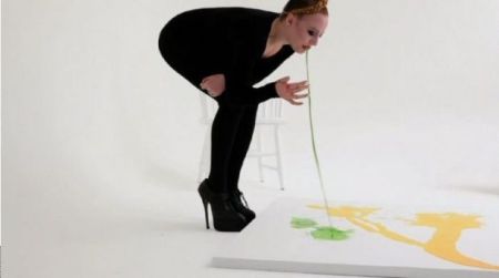 Сейчас искусством можно назвать всё что угодно. Люди, использующие различные извращённые приёмы, уже не шокируют и удивляют, а порядком надоели. Вот Милли научилась управлять регургитацией - движение жидкостей и газов, в обратном порядке, полых мышцах организма. Молодец, ни чего не скажешь. А она умеет рисовать кисточкой пейзажи? Я думаю, нет. Люди в наше время, уже не знают, как выделиться из толпы или реализовать своё больное воображение. Вот девушка вырвала на холст и это уже картина. А начинала с рвоты на свои наряды, и так же считали искусством. Но как всегда нет дыма без огня, раз она делает, значит, есть и поклонники. Я этого не пойму ни когда, так может, вы мне объясните, почему таких талантов не проверяют на психическое состояние? На картинках и видео можно увидеть, Millie Brown пьющей цветное молоко, далее изверженное на холст. По её словам, больше пары часов, рваться нельзя, так как можно повредить организму. Сзади, на звуковом сопровождении, две оперные певицы Патриция Хаммонд и Зита Сайм. Кстати она по моему, рвалась на одно из платьев для выступлений, Леди Гага.