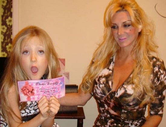 Машинки, куклы, мячики, книжки и многое другое, в сознании у простого человека как подарок для ребёнка. Но если человек необычный, то и подарки могут удивить неординарностью. Помните женщину по имени Sarah Burge? Напоминаю, она засветилась ещё пять лет назад. Про неё писала масса СМИ. Эвакуаторное в ней то, что ради своей прихоти стать очень похожей на Барби, потратила почти 500000 долларов, и перенесла 26 операций с ног до головы. На сей раз про Sarah Burge пишут из-за её подарка своей младшей дочке Poppy Burge. Подарочный сертификат на пластическую операцию. Не странноватый ли подарок? Мама так не считает, говорит ребенок сам попросил и это хорошее вложение денег, тем более 8 летней пластику ни кто делать не будет. Sarah Burge наверняка умная женщина и создаёт лишь пиар такими ходами. В бизнесе пластической хирургии, начинала с должности медсестры, а сейчас имеет собственную клинику. На предыдущие 6 и 7 лет Poppy, подарки были похожи, это были ваучеры на проведение разных пластических работ. Но, как и в прошлые годы, праздник будет на 100 персон с обширной развлекательной программой. И я вот не знаю то ли радоваться, что девочка ни в чём не нуждается, то ли грустить что мама немножко Барби