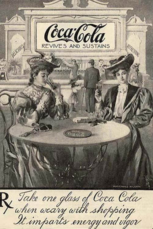 Ещё с начала 20 века Coca-Cola как и другие компании вела активную рекламную компанию. Это были плакаты, брошюры, листовки и стенды. На фото можно увидеть рекламную продукцию за многие годы существования компании и напитка. Кстати, компания Coca-Cola первой, создала видео рекламу и запустила её на ТВ. Тем самым положив начало эры, надоедливой телевизионной рекламы.