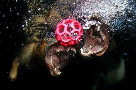 Фотографии, сделанные известным фотографом Seth Casteel. Фотографии сняты во время игры в мяч, нашими любимыми собачками. Его бросали под воду, и уже из-под воды, фотограф ловил интересные моменты подводных игр, разных собак. По-моему, получилось здорово и интересно. На некоторых фото, собаки выглядят как мифические чудовища, или того хуже, как инопланетяне