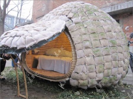 Daihai Fei - это тот студент, который действительно, хочет учиться и получать, знания не смотря ни на что. Молодой человек после переезда в Пекин, ужаснулся ценам на съёмное жильё. И в связи со своим весьма скромным бюджетом, он решил построить собственный дом, бюджет которого составил, чуть меньше 1000 долларов. Дэйхай Фей построил своё яйцевидное убежище на бамбуковом каркасе. Сам каркас обшит теплоизоляционными материалами, поверх которых располагаются сумки. В этих сумках трава и семена, он хочет, как в Норвегии, где часто используют травяные крыши. Травяная крыша так же будет полезным защитником от разного рода непогоды. На крыше же установлена солнечная батарея, мощности хватает для настольной лампы. Внутри дома уютно и компактно размещается кровать и маленькая книжная полка. Дом имеет колёса и за это, по праву можно его назвать самоходным. Так что студенты и абитуриенты, не расстраивайтесь, если не найдете жильё в другом городе. Вы сами можете его сделать, вашими прямыми и кривыми руками.