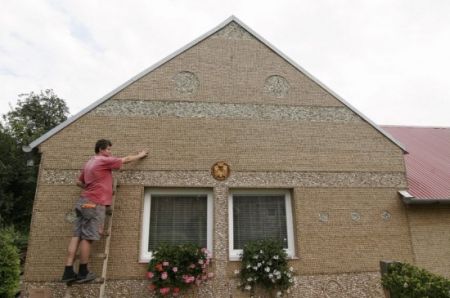 Miroslav Svoboda’s простой житель городка под названием Мутенице, что в Чешской Республике. Населённый пункт с населением около 5 тысяч человек обзавелся очень интересной достопримечательностью, благодаря этому гражданину. Мирослав украсил весь фасад своего дома винными пробками. Идея посетила его 2 года назад, когда он просто хотел украсить пару пустот на стенке. Вот и пришло в голову использовать столь необычный и интересный строительный материал. Тем более в их Южно-Моравской области, очень сильно любят пить вино, так что с пробками особых проблем не было. Мирослав Свобадас, сам собирал материал, да и друзья и знакомые приносили, сколько смогут. Пробки сначала вымачивали в специальных ванночках, дабы избавится от запаха и различных паразитов, микробов и плесени. Явно подошли к процессу основательно, что бы красота осталась на века. Каждая пробка была разрезана на две части, и заняла своё особое место на одной из стен дома. Мирослав все пробки монтировал вручную. Как он сам признаётся, всё это только для красоты. Так как дом очень добротный, с крепкими, толстыми стенами. Весь процесс был закончен совсем недавно, как раз к 50 летию строителя энтузиаста. Кстати, кожух космического корабля "Восток", на котором Юрий Гагарин вышел впервые в космос, очень сильно напоминает пробковое дерево. Так что стоит задуматься о пользе и практичности задумки Мирослава. В настоящие время, его дом одна из достопримечательностей, к которой организуют туристические автобусные туры.