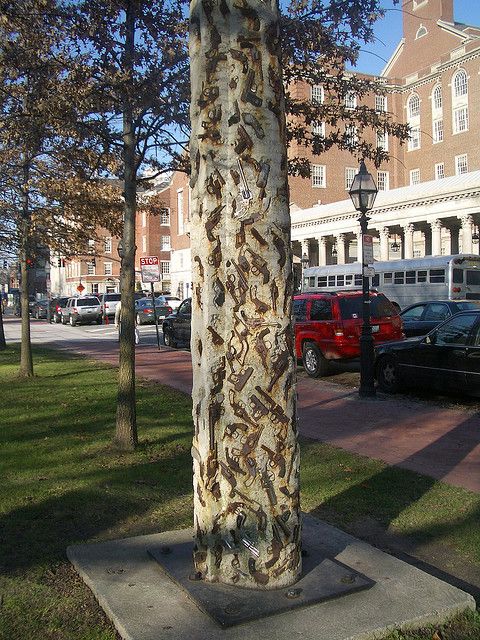 В самом маленьком штате Америки, Род-А́йленде, прямо напротив здания суда в городе Про́виденс, находится необычная скульптура из пистолетов. Создатель Boris Bally и все остальные, называют это "пистолетным тотемом". Железобетонный памятник состоит аж из 1000 стволов. Когда-то этими пистолетами пользовались бандиты и обычные граждане США. Но доктор Michael P.Hirsch разработал специальную программу "Guns for Goods", и с помощью её собрал уже более 11000 единиц оружия. Суть её проста, вы приносите своё оружие на утилизацию и получаете живые деньги или сертификаты на определенную сумму. На данный момент, программа работает во многих городах Америки. Доктора Хирши сподвигло на это работа в городе Питсбург, где насмотрелся на ужасы огнестрельных ранений. Это было в далеком 1994 году, когда был очень высокий уровень преступности. Тогда Hirsch с коллегой Matthew Masiello, начали организовывать выкуп оружия у населения. Не будем забывать, что в США почти без проблем можно купить, легально и нелегально, различное стрелковое оружие. Художник Boris Bally и доктор Michael P.Hirsc, решили создать совместную акцию, так и построили "пистолетный тотем", как напоминание о том зле, что несёт оружие. И лучшего места, чем как перед федеральным судом нельзя было придумать. Кстати пистолеты, бесполезно отковыривать из бетона, они заблаговременно прошли утилизацию.